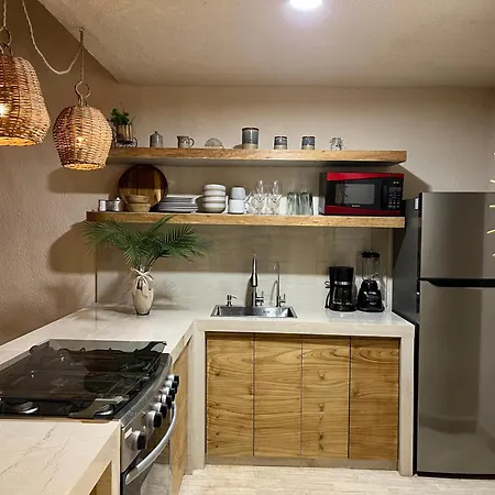 Eine Küche ist in diesem Apartment ebenso vorhanden wie eine Mikrowelle, ein Kühlschrank und Küchenutensilien darauf. Für einen bequemen und entspannenden Aufenthalt im Apartment stehen den Gästen Ausstattung zur Kaffee- & Teezubereitung zur Verfügung. Nur 1 Kilometer von dieser Unterkunft entfernt werden französische Speisen im Restaurant La Palapa Belga aufgetischt.